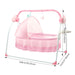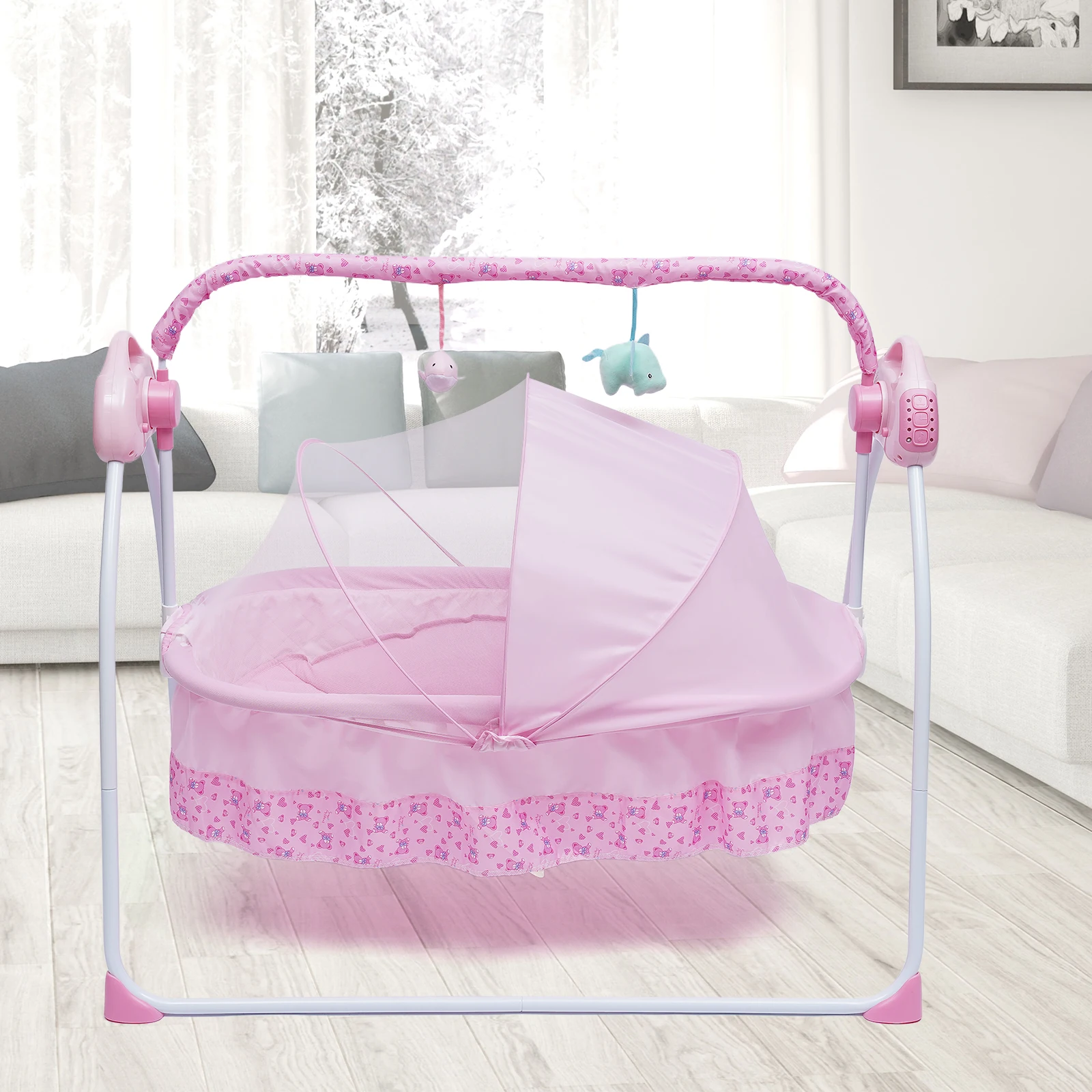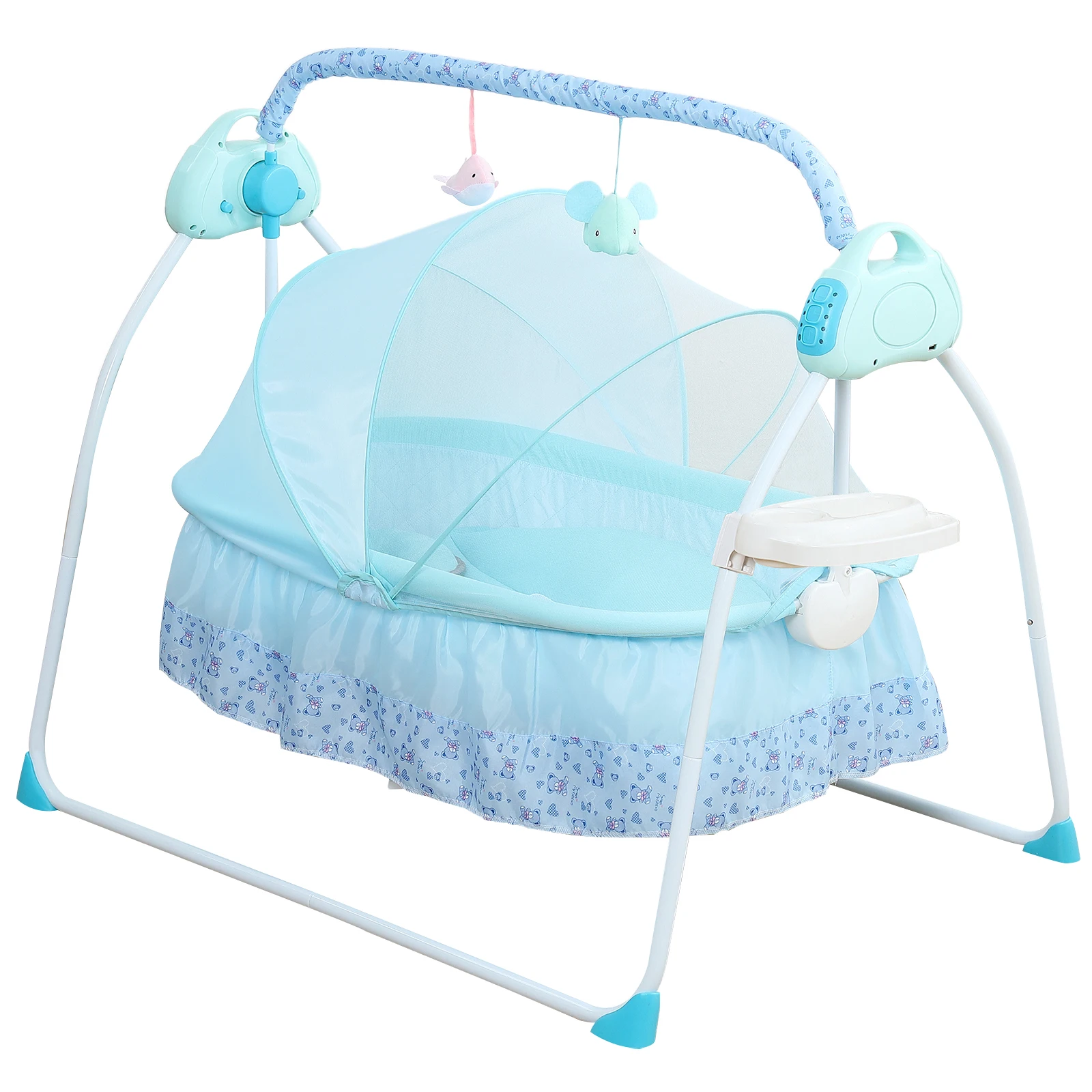 It can be used to coax your baby to sleep and quiet your crying baby indoors and outdoors. It is also suitable for playing and listening to songs and stories in this baby cradle swing.