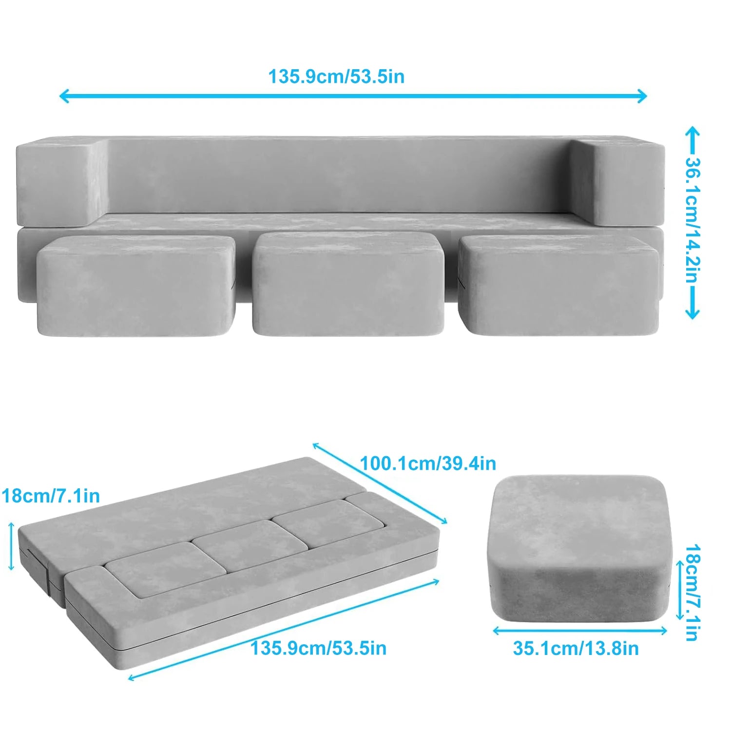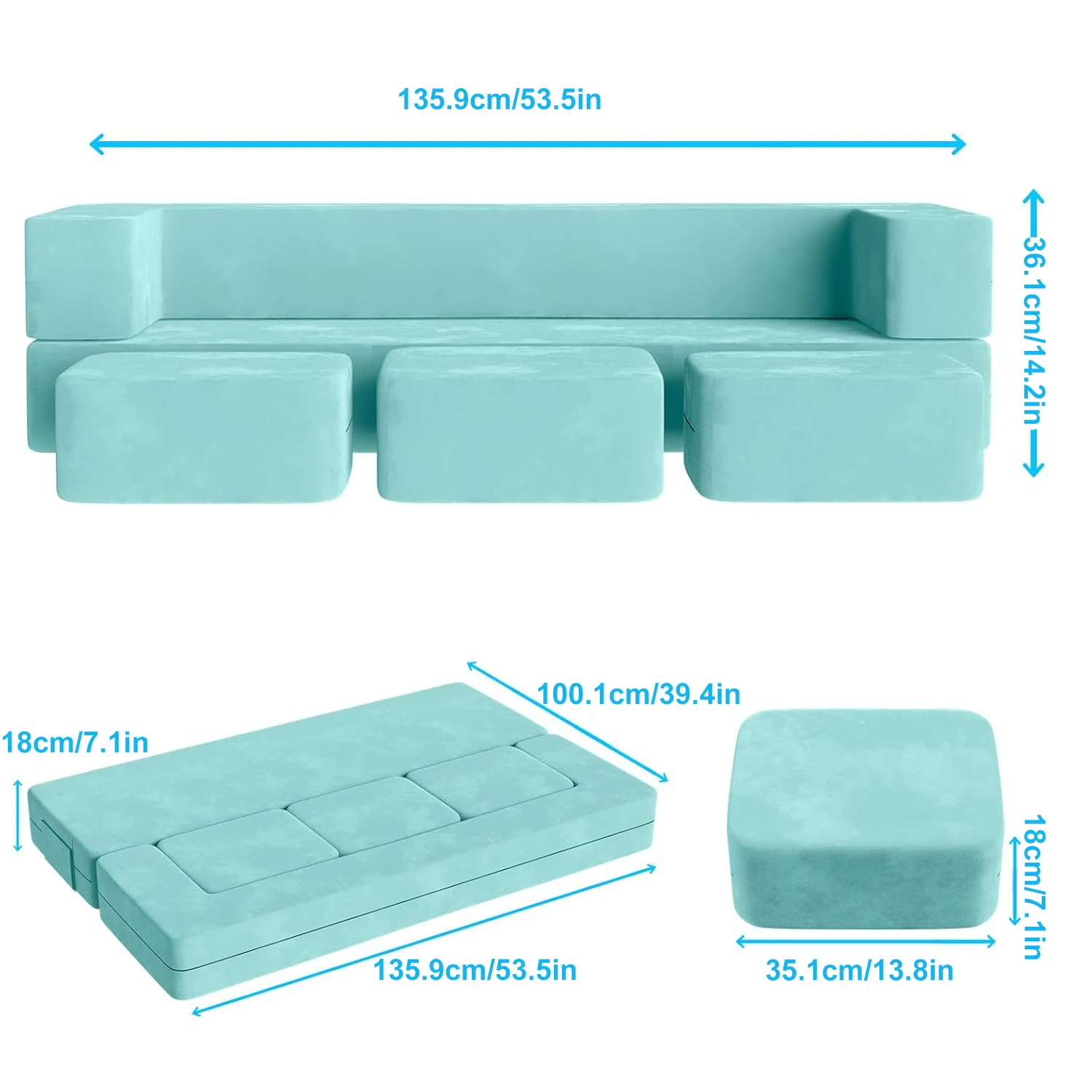 FIRING IMGINATION AND CREATIVITY: Enjoy the kid couch sofa converting different functions. These 10 foam pieces can become a car, a tent, a church, a scooter, a castle, a slide, a sofa, a bed lounge, or anything that your children can imagine. Meanwhile, this toddler play couch is a decorative modular sofa for playrooms, bedrooms, children's rooms, and nurseries. A perfect playroom addition for playing and inspiring imagination.