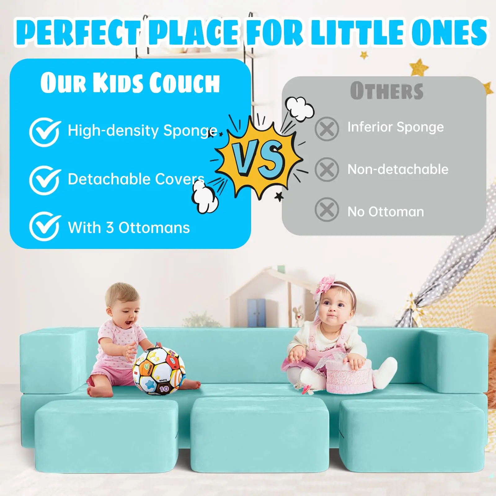 A WONDERFUL GIFT FOR YOUR KIDS: If you are looking for a great gift for children, then you would love our 12pcs Modular Kids Couch. These thick foam and cozy fabric make the sofa super cute and soft. If your toddler is learning to walk and climb furniture but is afraid to let him sit on the lounge couch and fall on the floor, this kid's foam couch will give you peace of mind. They can build an infinitely creative play land on their own and light up your every home interior!