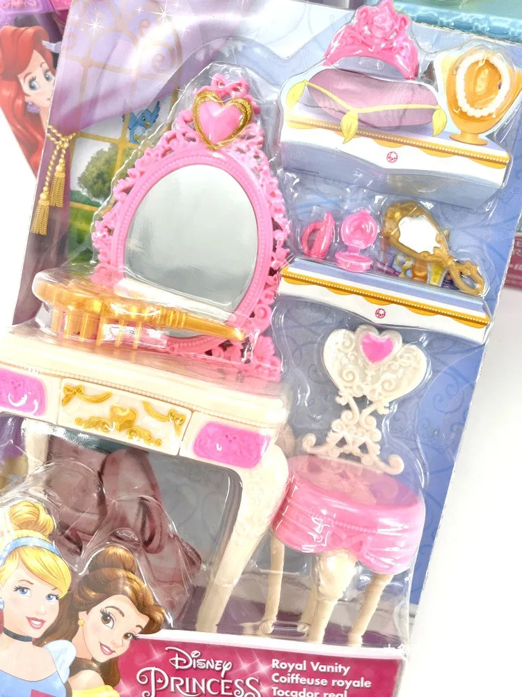 Build out the world of Disney Princess with this royally themed vanity set that's fit for every Disney Princess doll! The vanity set includes a vanity with a mirror and drawers that open, as well as a chair, hand mirror, tiara, brush, and more. It's great for helping a Disney Princess get ready for a grand ball or an even grander adventure! Dolls sold separately.